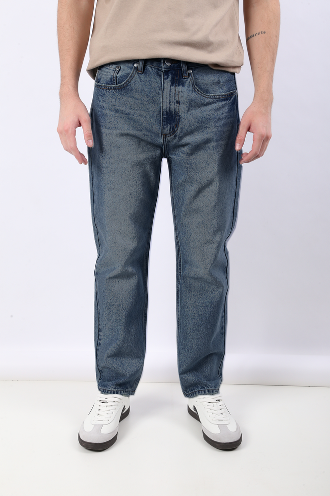 JEAN RECTO CON EFECTO LAVADO 100% ALGODÓN BOTONES EN DELANTERO, AVÍOS PERSONALIZADOS Y ETIQUETA PERSONALIZADA DE "PU" EN PARTE TRASERA . BOLSILLOS DELANTEROS Y TRASEROS. APLIQUE METÁLICO EN BOLSILLO TRASERO IZQUIERDO. EL MODELO USA UN TALLE 32