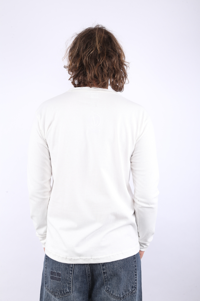 REMERA MANGAS LARGA CON PUÑO CONFECCIONADA EN JERSEY 16/1 %100 ALGODÓN. ESTAMPA TACTO CERO EN DELANTERO. EL MODELO USA UN TALLE M.