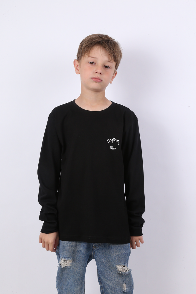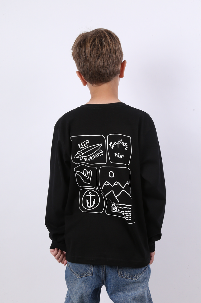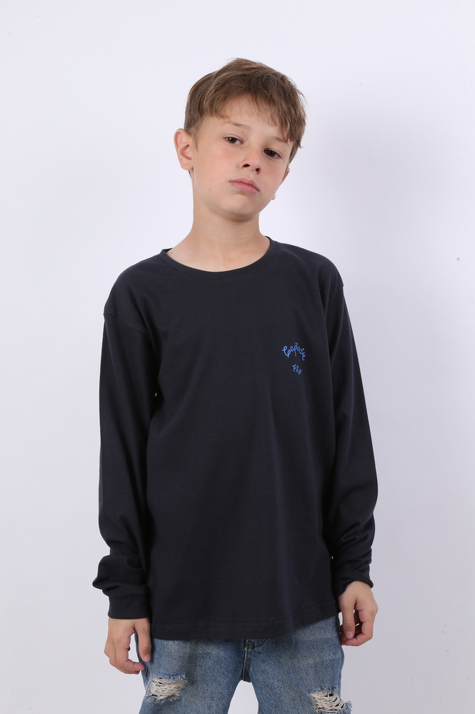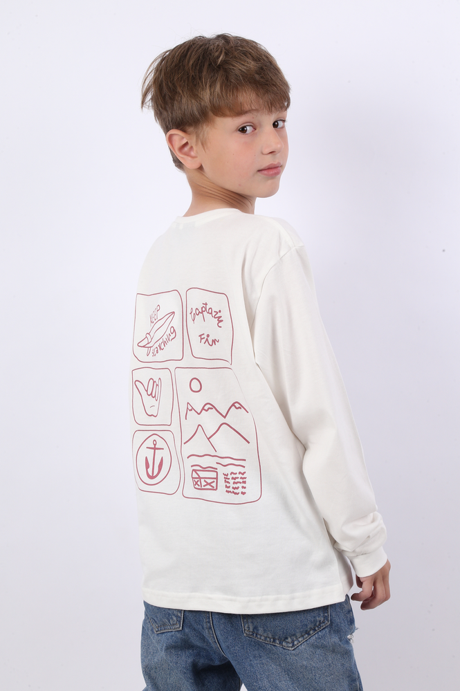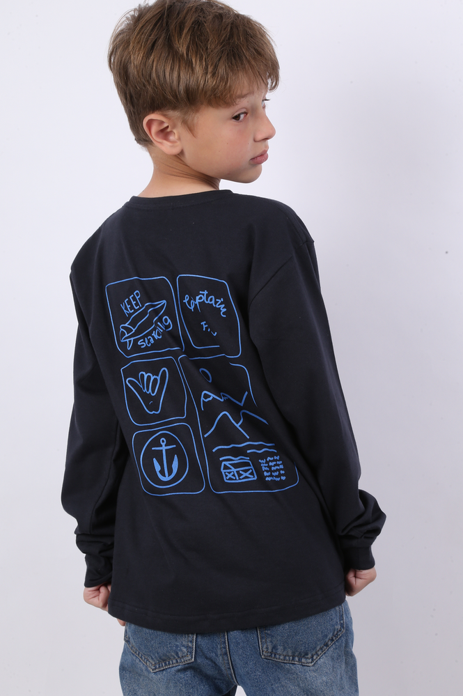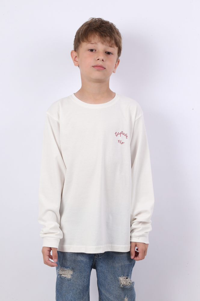 REMERA MANGAS LARGAS CONFECCIONADA EN JERSEY 24/1 CON ESTAMPA TACTO CERO EN DELANTERO Y ESPALDA. 100% ALGODÓN. EL MODELO USA UN TALLE 12