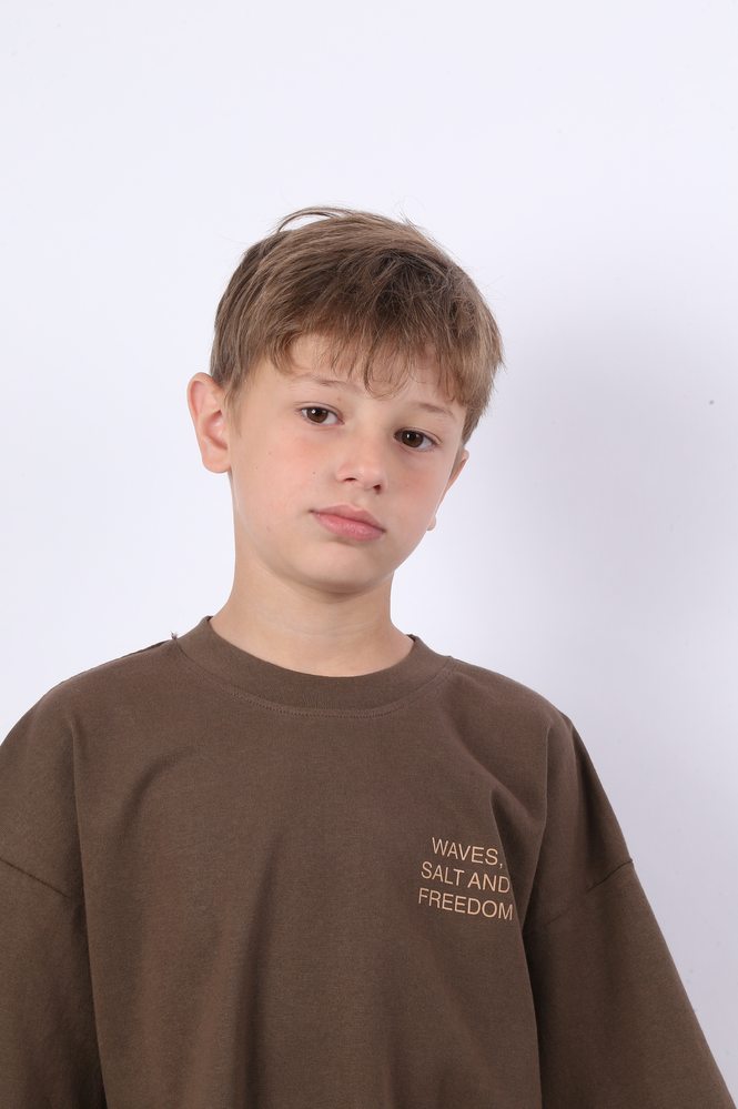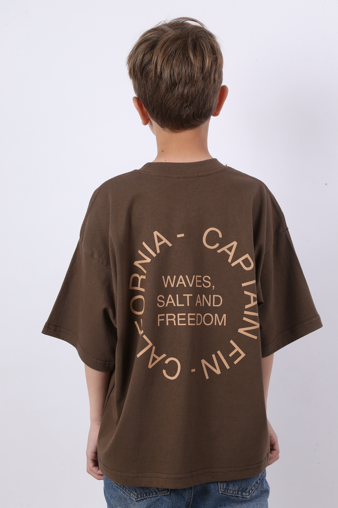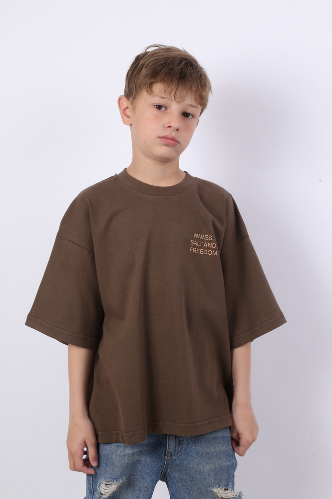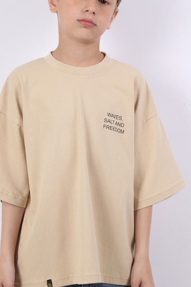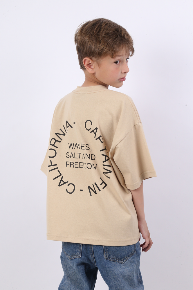 REMERA MANGAS CORTAS BOXY FIT CONFECCIONADA EN JERSEY 16/1 CON ESTAMPA TACTO CERO EN DELANTERO Y ESPALDA. 100% ALGODÓN. EL MODELO USA UN TALLE 12