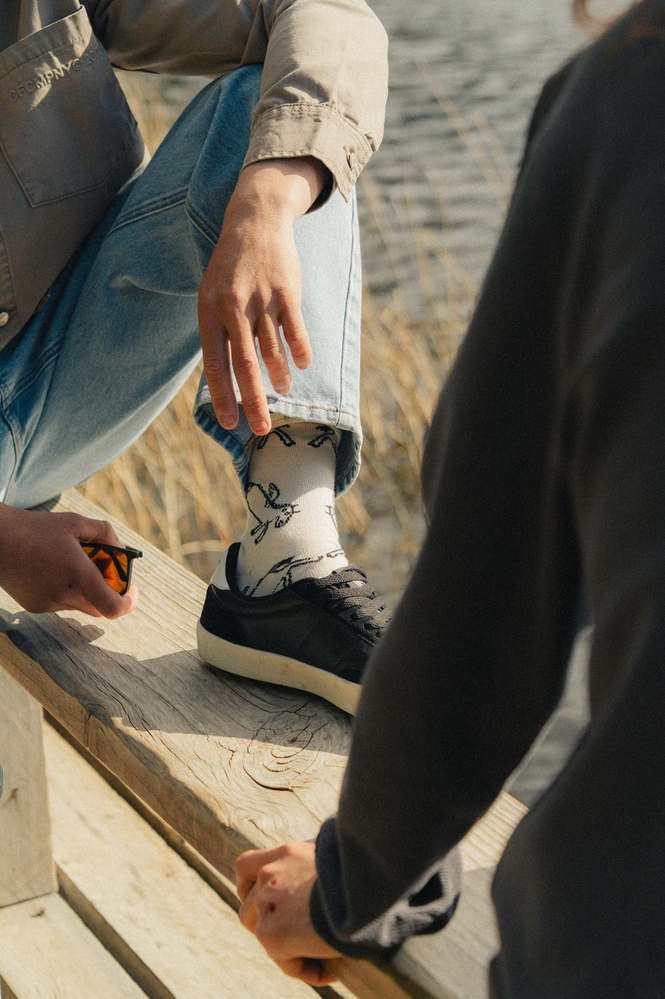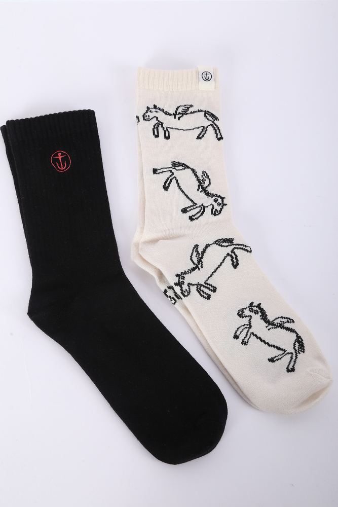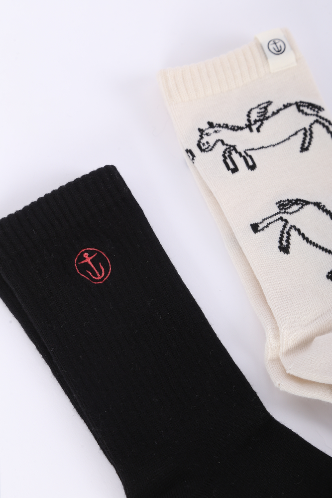 EL PACK CONTIENE: 1 PAR DE MEDIAS CREAM HORSE ESTAMPADAS CON ETIQUETA TEJIDA Y 1 PAR DE MEDIAS NEGRAS CON LOGO BORDADO EN CAÑA LATERAL