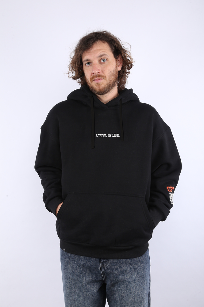 BUZO CANGURO CON RECORTE. BOLSILLOS FRONTALES Y CAPUCHA CON CORDÓN AJUSTABLE. BORDADO EN DELANTERO Y PARCHE EN ESPALDA. COMPOSICIÓN: 60% ALGODÓN / 40% POLIÉSTER. ACABADO "PIEL DE DURAZNO" MUY SUAVE Y ATERCIOPELADO AL TACTO. EL MODELO USA UN TALLE M