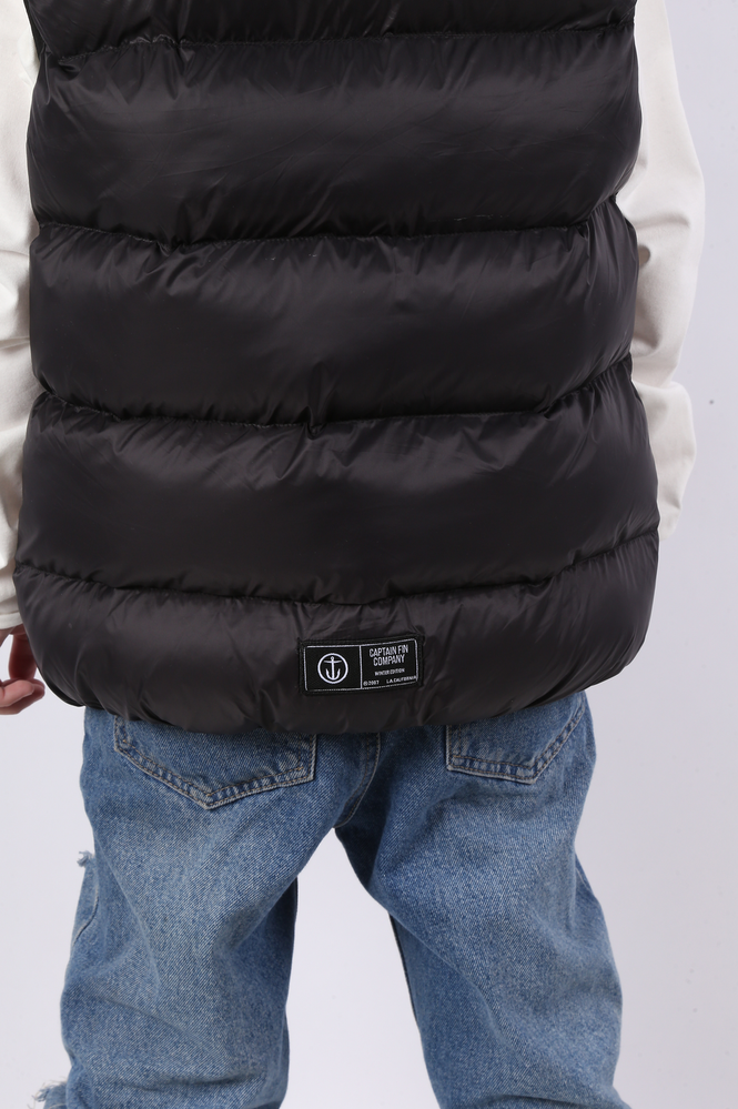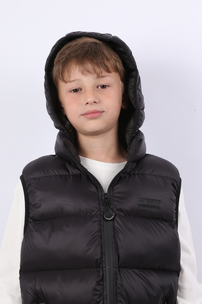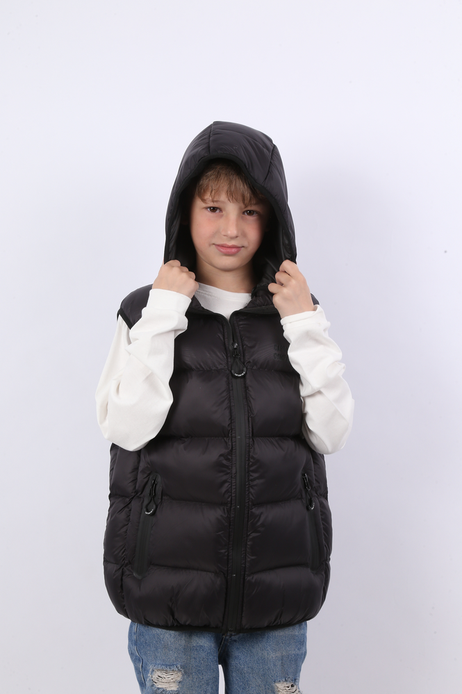 CHALECO CON CAPUCHA DESMONTABLE CON CIERRE, CIERRE WATERPROOF CON TIRA CIERRES PERSONALIZADO, BOLSILLOS CON CIERRE WATERPROOF, ESTAMPA EN SILICONA 3D EN DELANTERO Y PARCHE TEJIDO FESTONEADO EN LA ESPALDA. COMPOSICIÓN: 100% POLIÉSTER